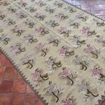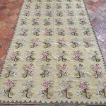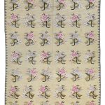 An early 20th century Bessarabian Kilim woven on a pale soft yellow background, gentle pink and grey toned flowers on this watery background design. Such a delicate and attractive decorative Kilim for 1920, condition wise it is perfect with no damage. These antique kilims are wonderful to place in rooms all over the home, we supply brilliant underlay with all our rugs which helps keep kilims secure on all types of floors.