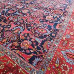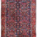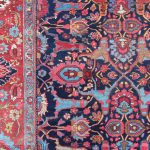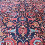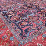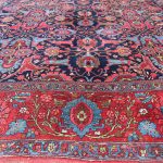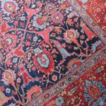 Rugs from Bidjar are very tough due to their structure which consists of usually five weft threads, two are loose wool threads followed by one taut cotton thread, then a further two loose wool threads. These are tightly beaten together against the knots, creating an extremely tight, compact rug. They tend to be floral in design, with the ‘Herati’ fish design commonly used in the main field and border.