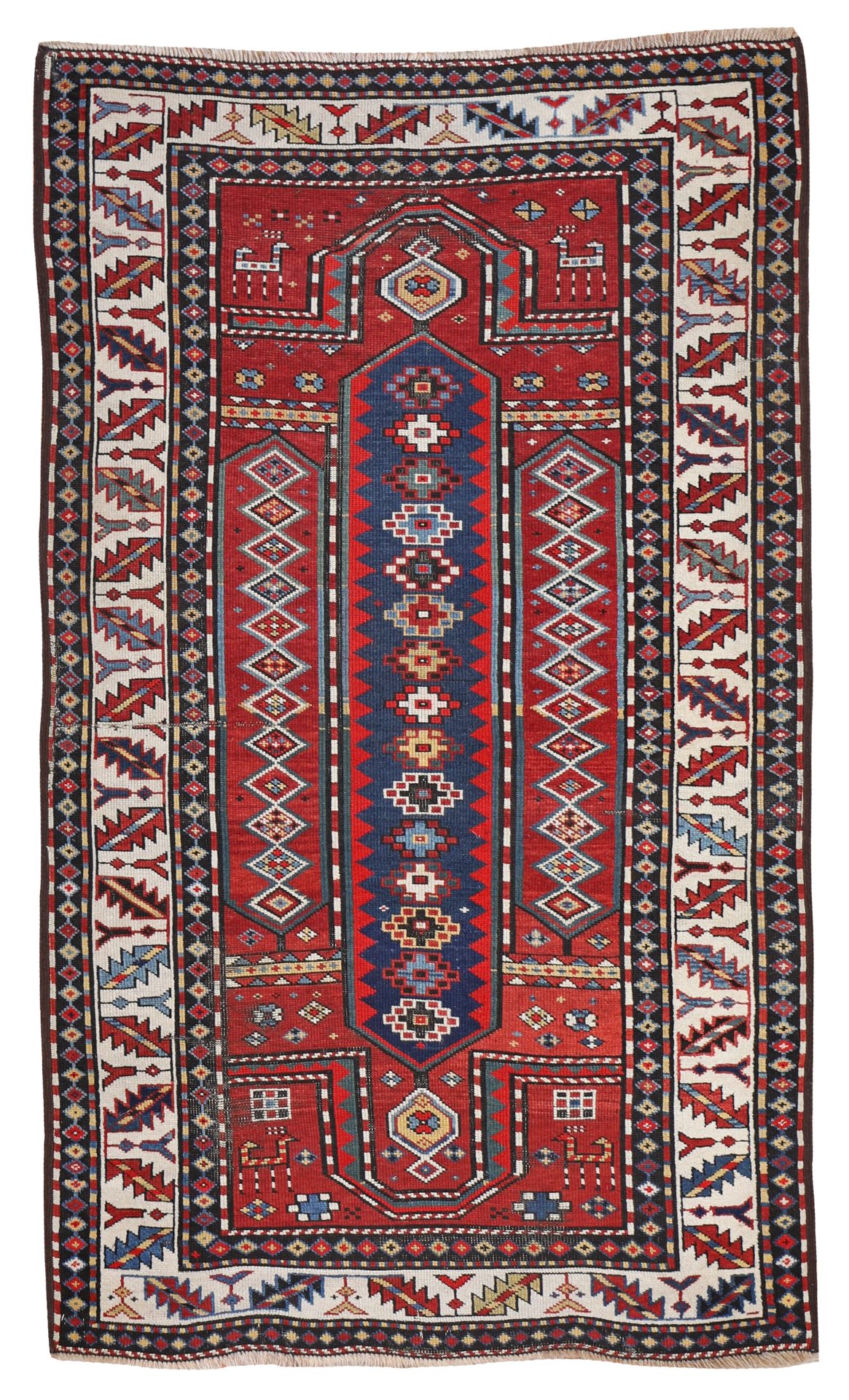 A lovely double niche antique Kazak rug, woven in the early 20th century and with some wonderful tribal animals in the main design. We love the ivory border design, really lifts the palette on this traditional geometric pattern. Great pale blue dyes and small soft yellow dyes can be seen too. Kazak weavers used lush soft wool, and often had a thicker pile than other Caucasian rugs such as Shirvan or Talish. This rug is lower in pile and does have some wear and one old split which has been well secured.