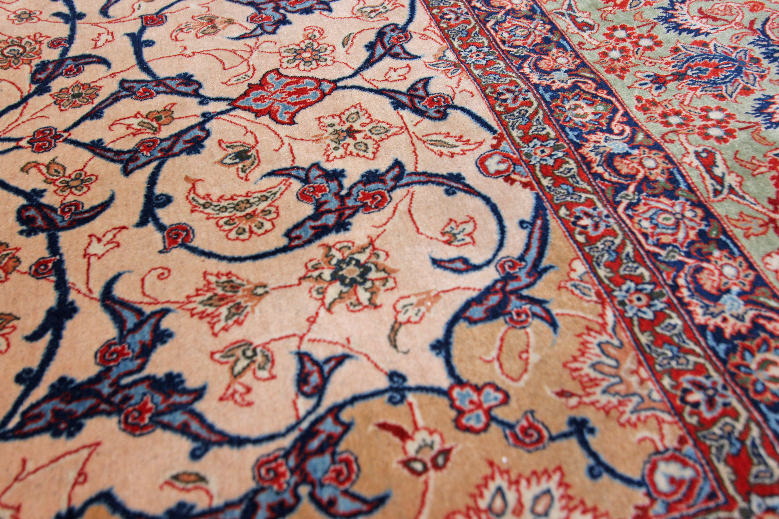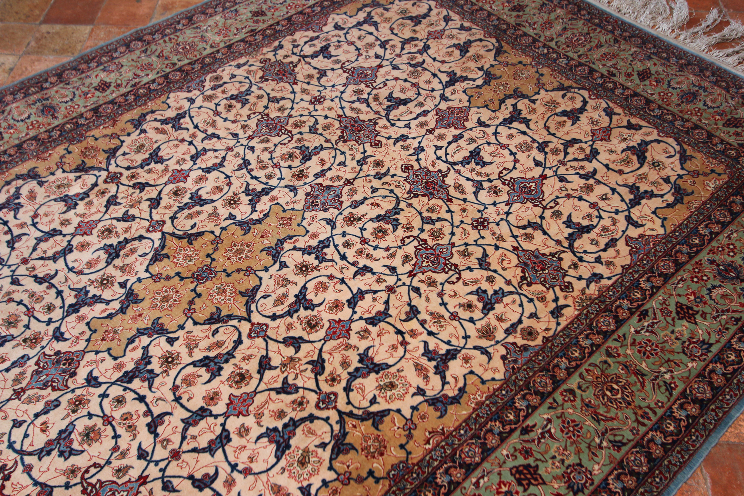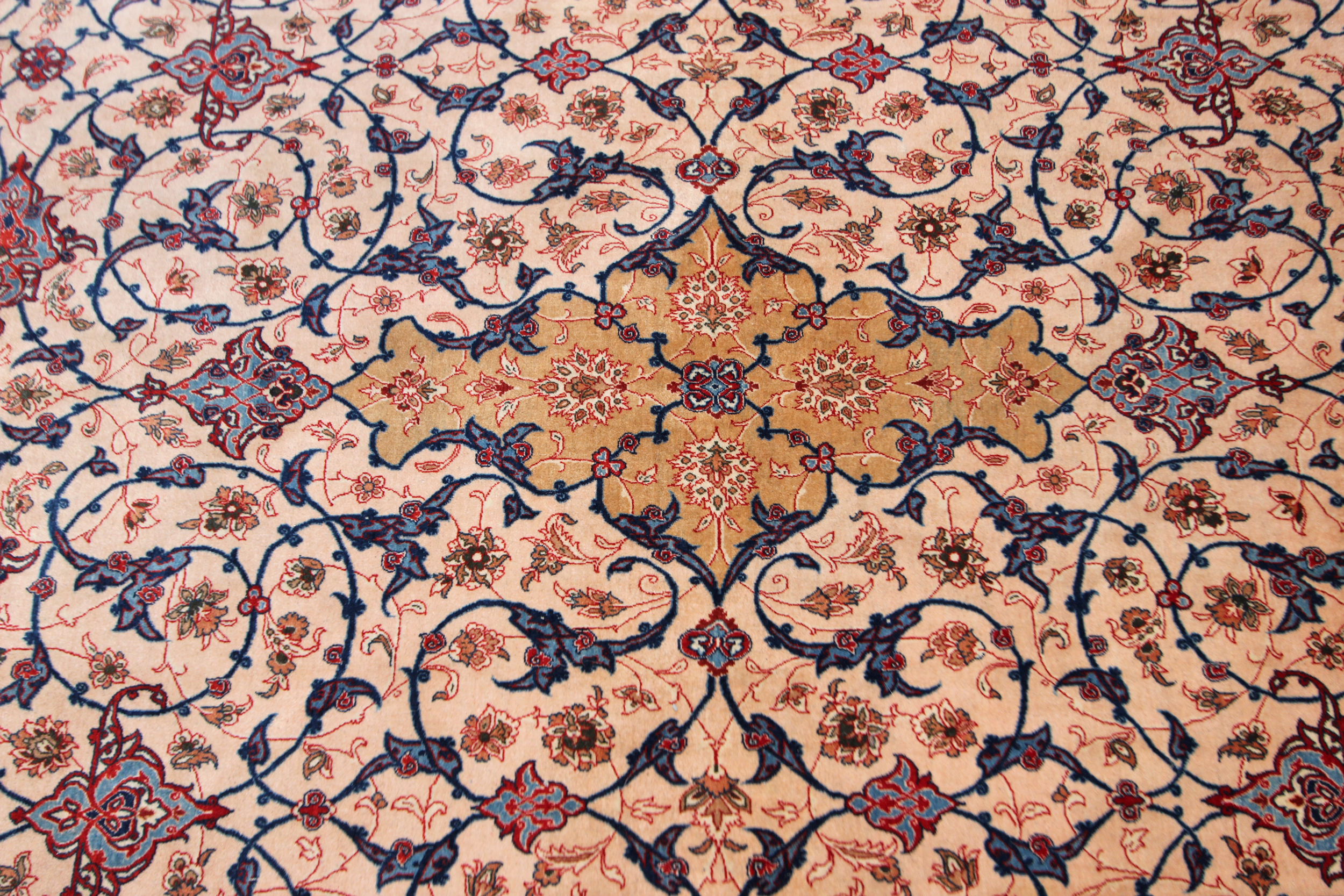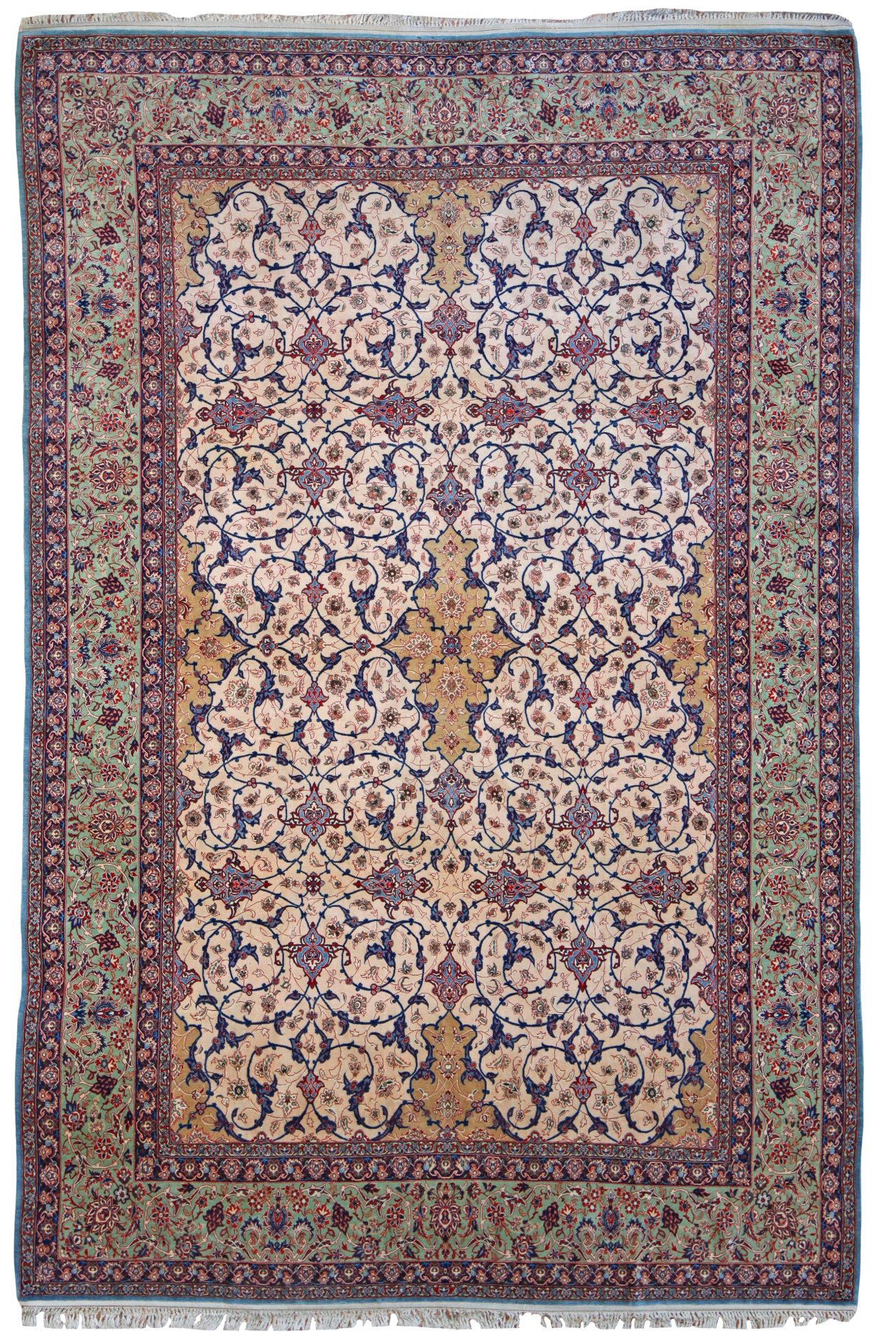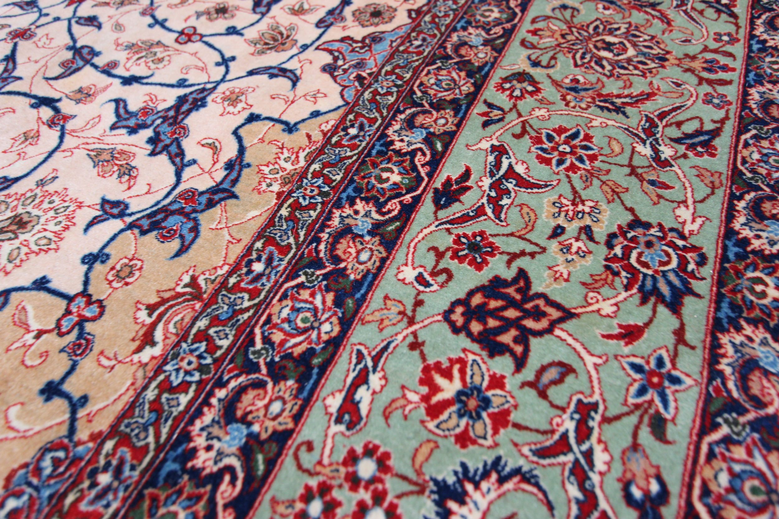Isfahan is situated virtually in the centre of Persia, and was once the capital city. The rugs are woven in the city itself and the surrounding villages. Starting in the early 17th century, their name was renowned throughout Europe – this has continued to the present day. Although rug making was interrupted by the Afghan invasion, it quickly re-established itself as a major centre for the finest handmade carpets. This example show cases why Isfahan are famous for weaving the most detailed, beautiful fine carpets.