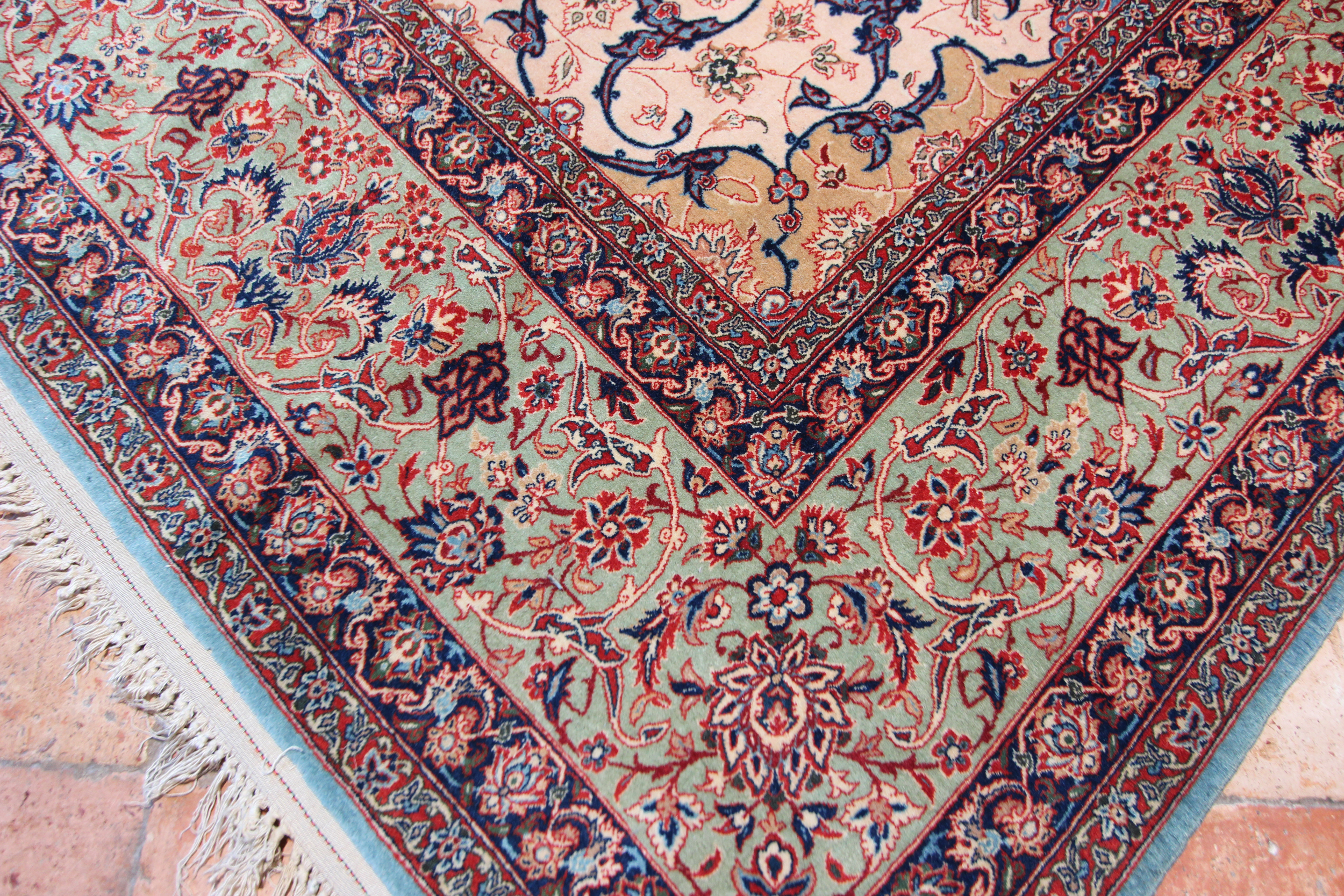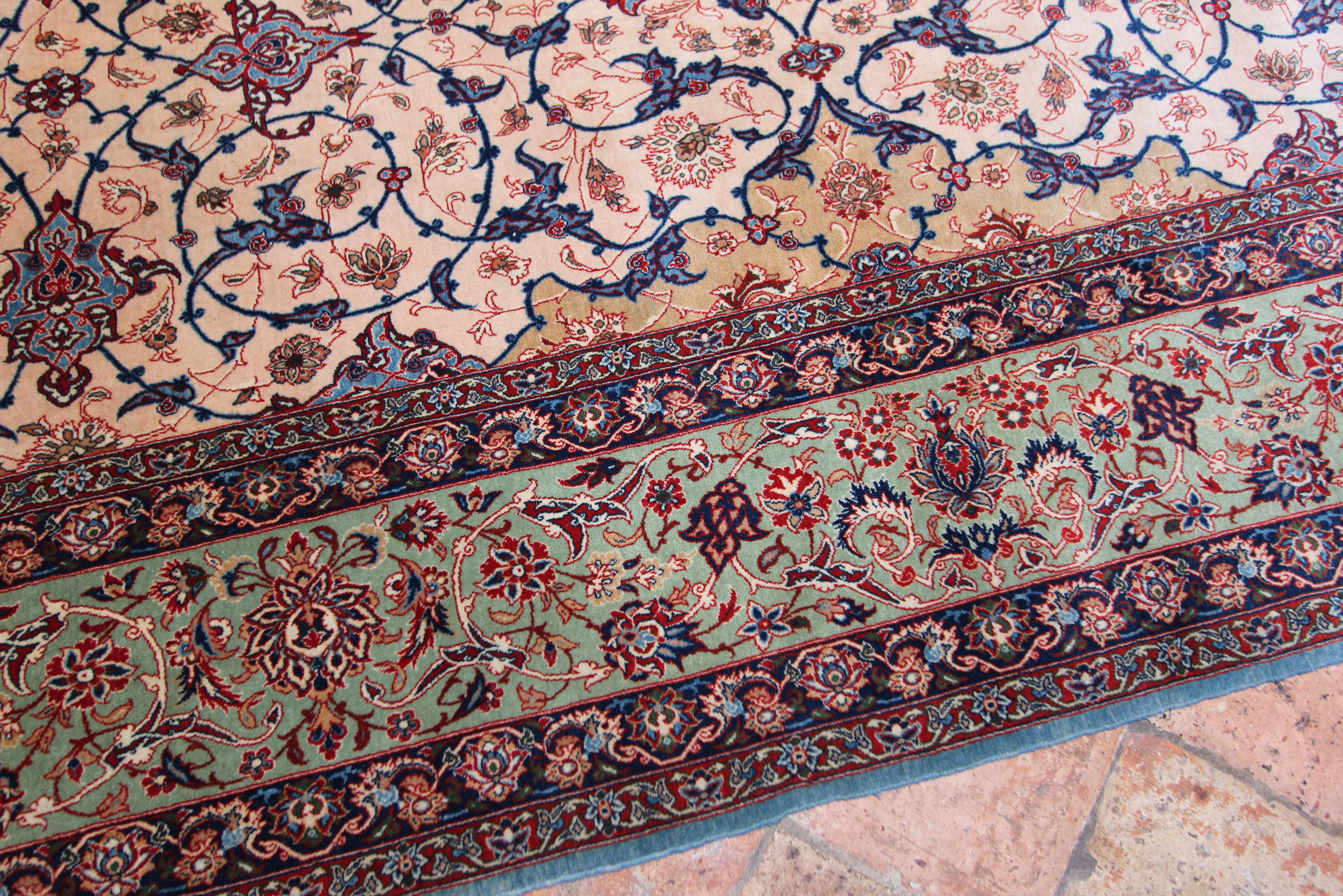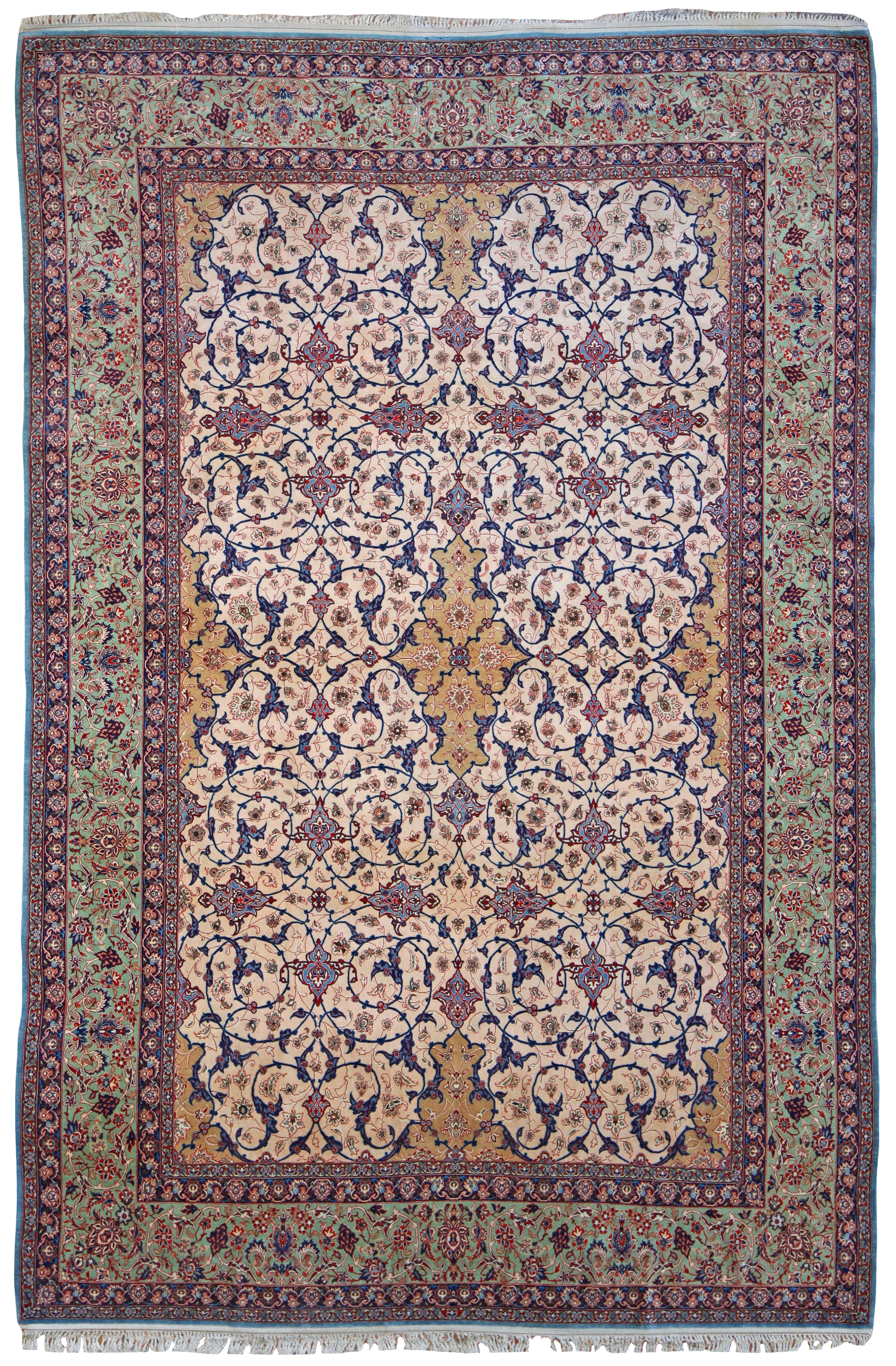 We have the original receipt showing it was then purchased from Mr & Mrs Wilson in 1984 for £12,000 from their home in Ashley Gardens. The condition is perfect and the weave is exceptionally fine, being woven on a silk foundation this is the finest type of Isfahan weaving available. It has both amazing detail and the rarest colours, the pale pistachio green border being one of the most expensive colours to manufacture. An amazing piece of history, available on the market for the first time in 60 years.
