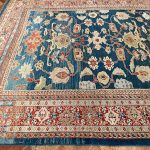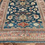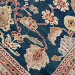 A remarkable and early production antique Ziegler carpet woven in Sultanabad, Persia – dating from 1883 to 1890 the size is unusual being 12 x 7 feet.  More often we find these highly sought after decorative Ziegler’s in standard rectangular sizes or in very large sizes. The design is breathtakingly beautiful, well proportioned for this elongated size with scrolling vines and floral motifs, the colour palette is exquisite too.  Full of amazing natural dyes which have faded over the last 120 plus years, warm reds on a deep indigo blue background, gentle pinks, pale blue/greys and muted gold tones. A stunning palette of colours to place in a drawing room, study, under a dining table or in an entrance hall.