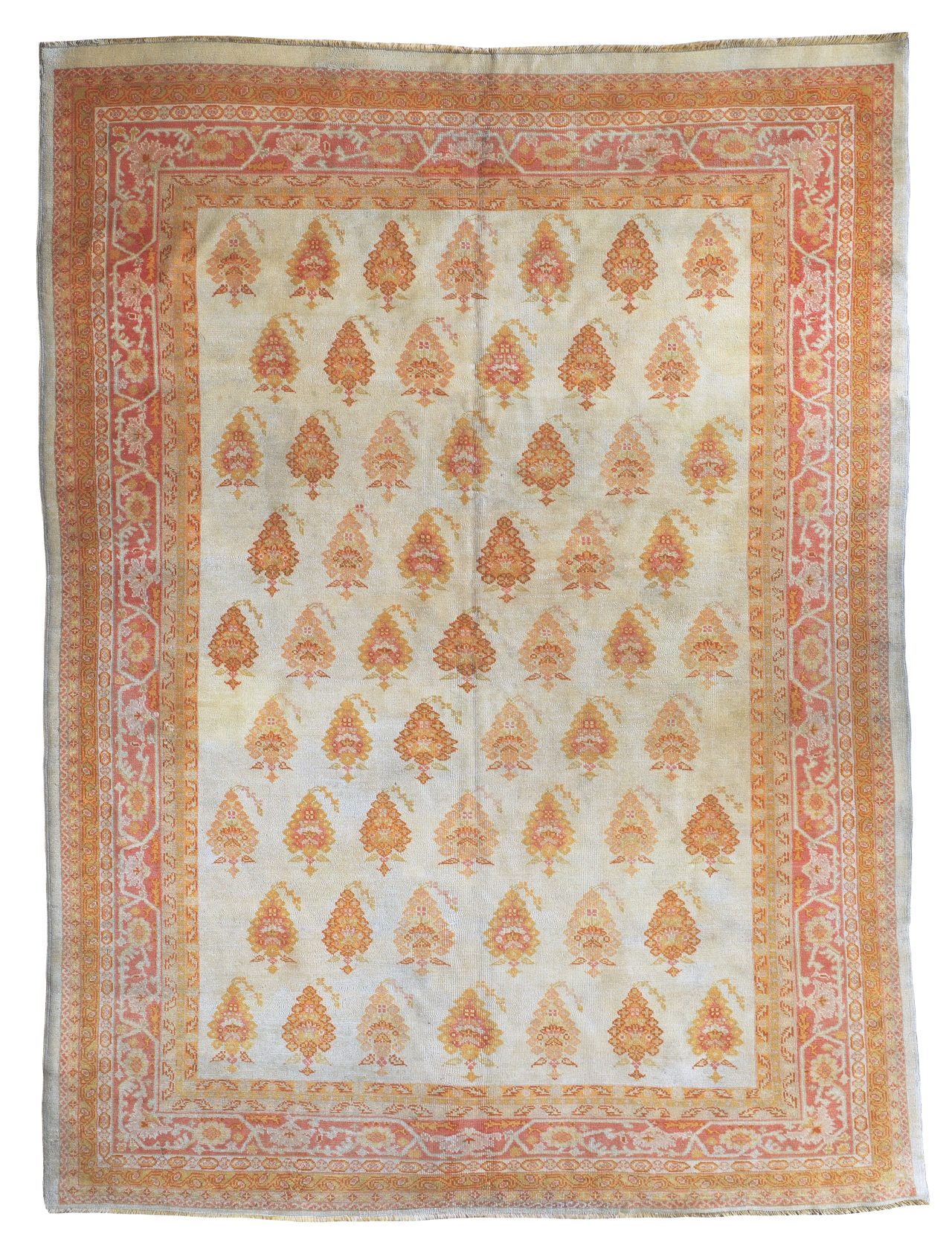 From the late 19th century, this is stunning antique Sivas carpet, with a rare Boteh design, the off-white palette with soft pinks and yellows is wonderful. With a cotton foundation it allows for a finer weave compared to other Turkish carpets such as Ushak. The design is classical and Persian in influence, but much more open with an exquisite palette and gentle design.