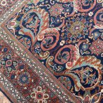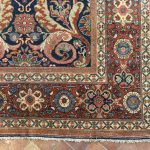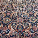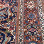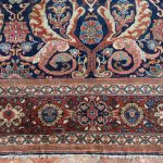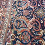 The dyes are all natural with deep madder red/orange border colours, wonderful indigo blues, and pale blues on the floral design which lift the whole composition of the carpet. With some stunning green and gentle dusky pink floral motifs too. It is interesting too how some of the flowers are yellow and blue at one end and change as time went on weaving the carpet. These characteristics are always what draw people to antique carpets, as there is always something interesting to look at and admire.