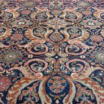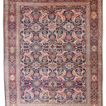 A beautifully elegant antique Mahal carpet with an elaborate and floral design woven in Persia in the late 19th century. The design is almost an adaptation of the famous Mustafi patter which the Persian prime minister during the late 19th Century commissioned artisans to create a scrolling spiralling version of the ‘Gol Farang’ (which is a foreign flower; inspired by French and English florals) pattern that was immensely popular at the time. As Ziegler & Co had inspired and created decorative floral carpets being woven in Sultanabad in the late 19th century other workshops locally followed suit and these designs were made in competition.