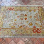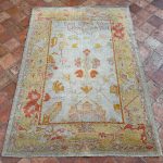 A beautiful very pale and rare antique Ushak rug in lovely original condition, the palette of dyes used are extremely rare to find, more often Ushak or (Oushak’s) were woven in larger sizes and in warmer colours. As this rug is from the late 19th century the dyes have faded and the abstract floral design is quite spectacular. With a golden yellow border and warm brick reds, it balances beautifully with the natural ivory/grey toned wool main background colour. The rug is original condition with no damage or issues to report, a rare and collectable decorative item.