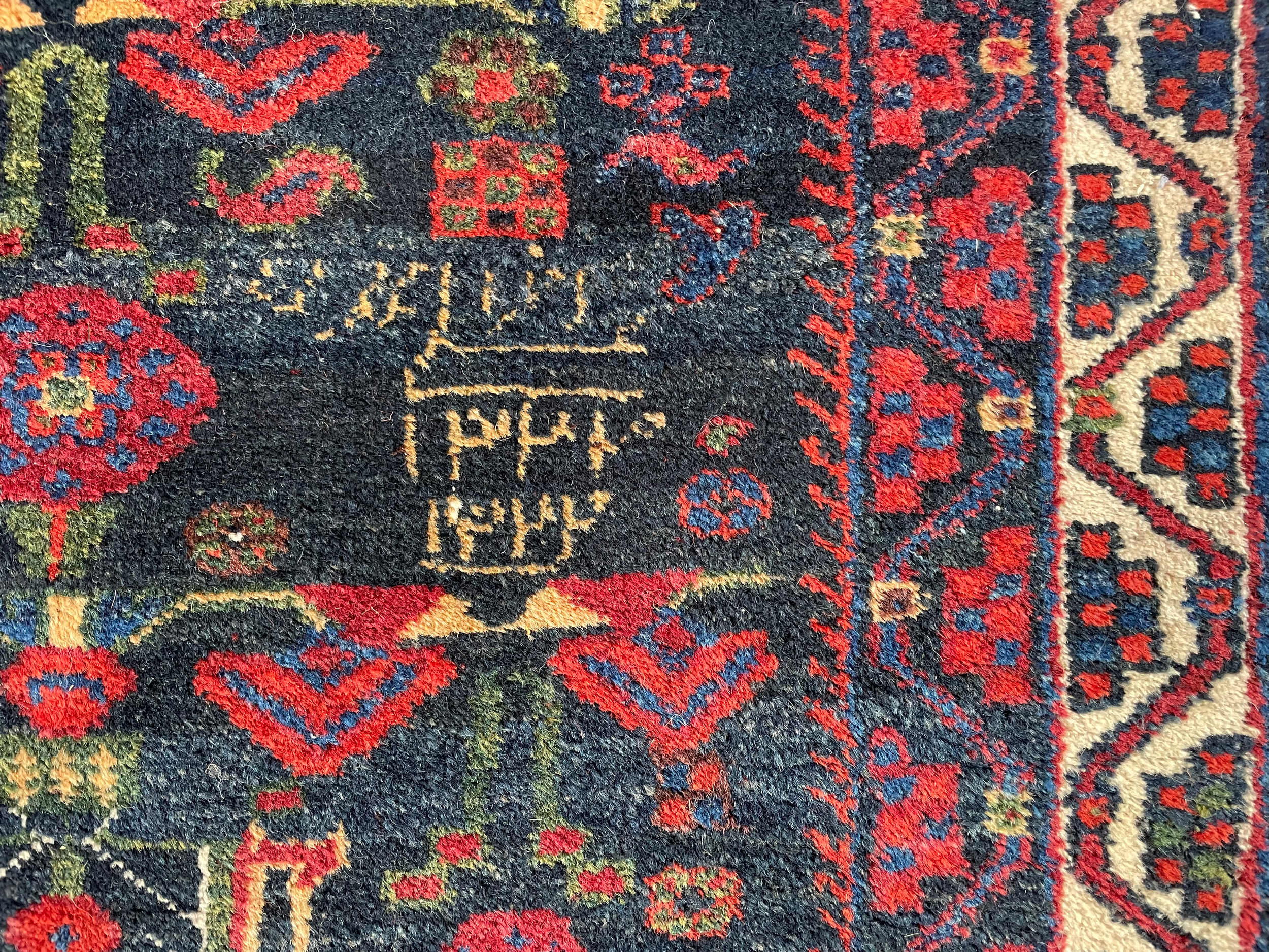 A richly coloured antique Antique Afshar rug woven in the south-west of Persia with the islamic date 1322 which translates to 1905. Varying dyes of green, reds, pinks and deep blue to almost black dyes. In great condition with a soft wool pile and even the colourful Kilim end showing at the top. These often get lost over time, so a lovely part of a rug to be still intact.