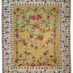 An elegant and refined antique Bessarabian Kilim woven around 1930 in near perfect condition. The variety of yellows used for the background are wonderful, a perfect backdrop to the vines and red roses with green leaves. The border colour background is a pale blue/grey and compliments the main dyes of green, pink and red. The flowers have been woven expertly and on the background and work so well to create a highly collectable and decorative antique kilim.