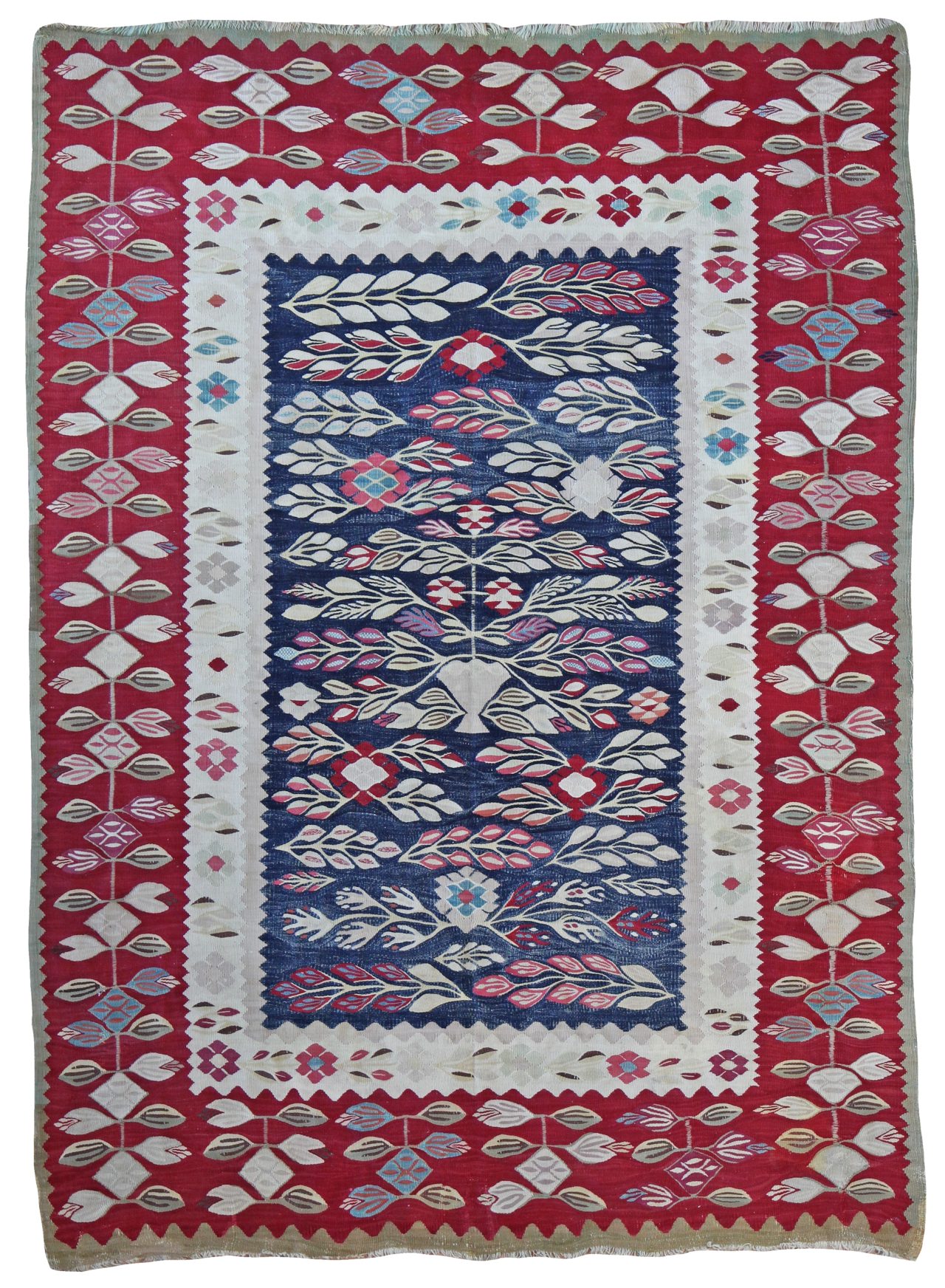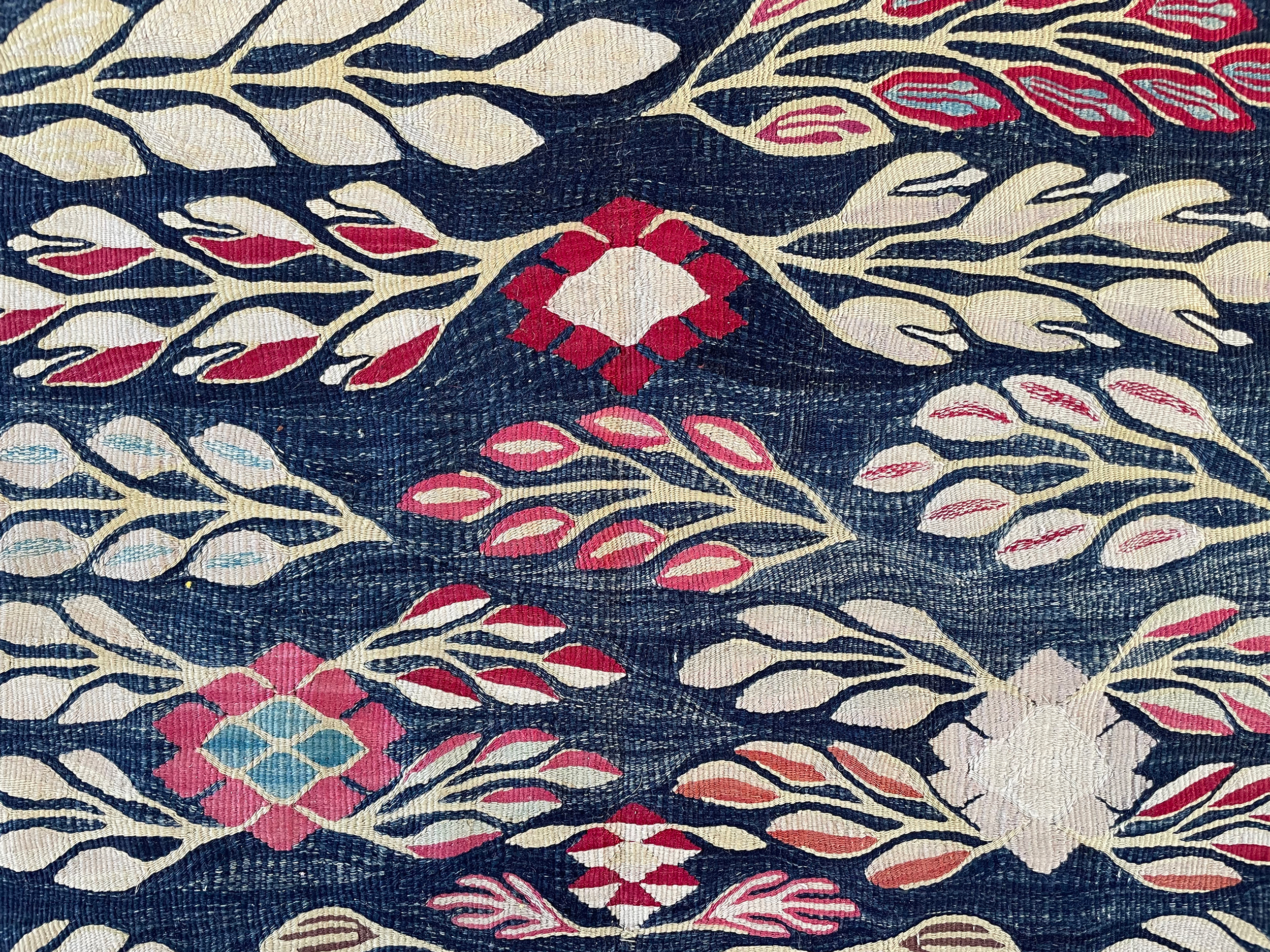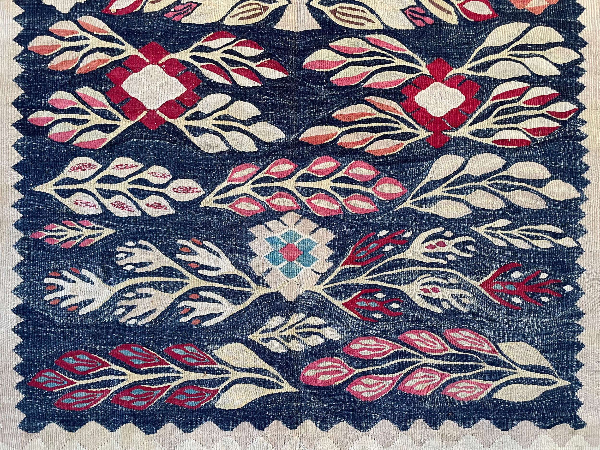 Exquisite antique Thracian Kilim from the late 19th century in wonderful preserved condition. From a private collection it has had a light fabric backing on for a long period of its life, used predominantly in a bedroom. Woven with gorgeous natural dyes, the deep reds of the border balance beautifully with the varying watery indigo blues in the main field.  The weaver has used variants of blues in an almost wavy pattern which is supposed to represent water.  With gentle pale blues, pinks and ivory wool the balance of colours is perfect.  We can also see a small one way flower in the centre of the kilim, a very pretty decorative piece.
