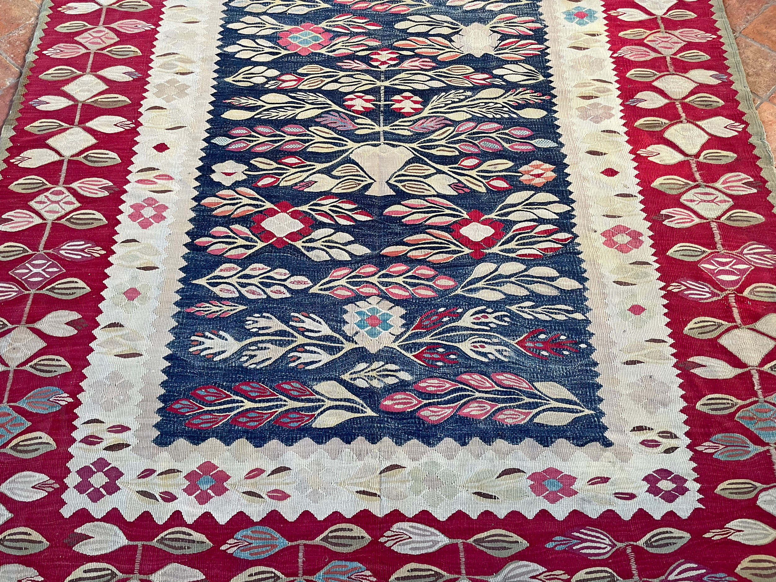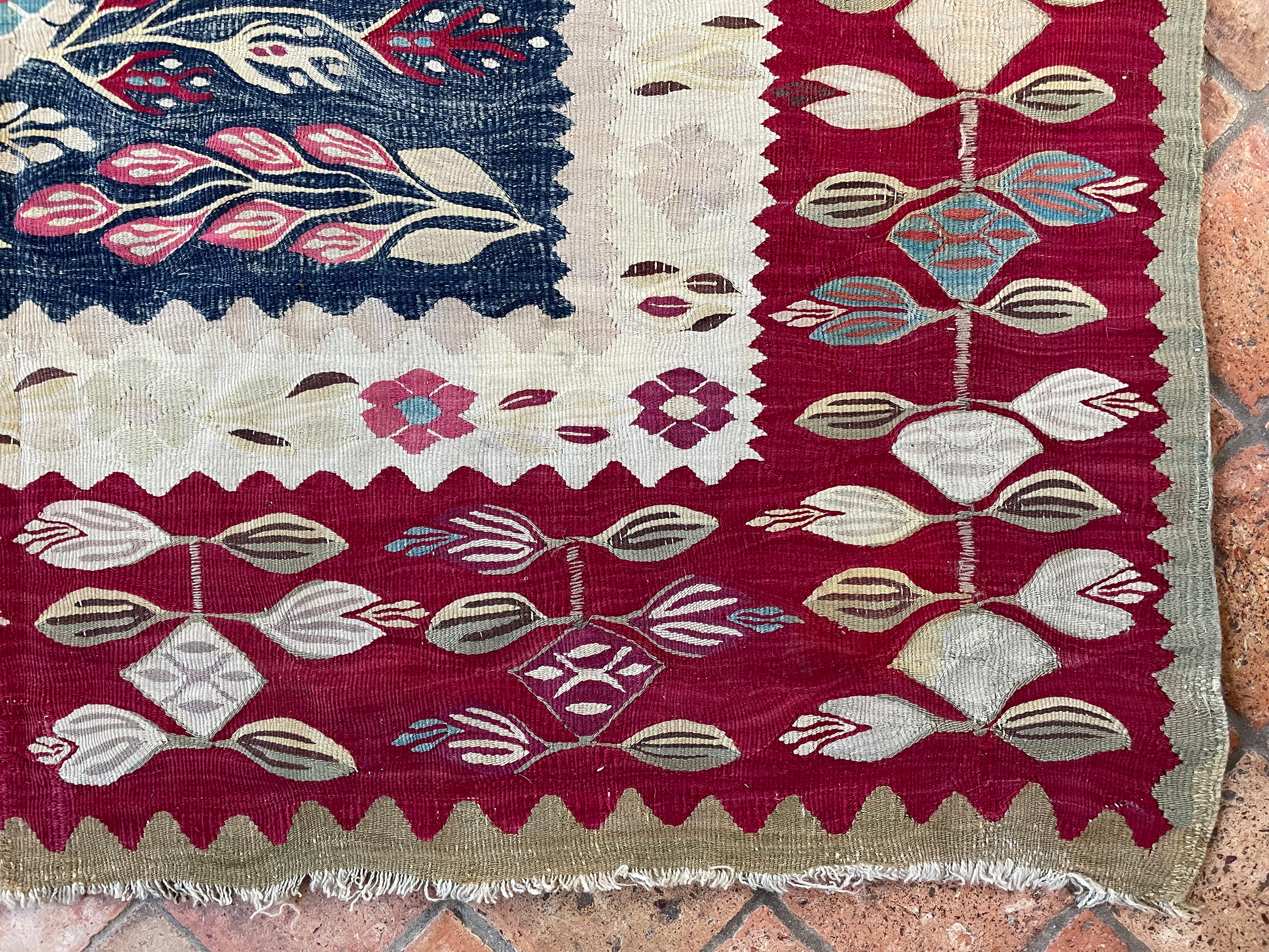 Thracian Kilims are generally of a fine weave, with motifs of stylised leaves, birds sitting on branches and tree of life designs.  Prayer Kilims were also woven, as well as hooked diamond-shape medallions too. They favoured deep reds, blues, greens with whites and little yellow.   They are collectable and fine weavings, with their structure using a slit-weave technique.  Rare to find a late 19th century example in such wonderful original condition.