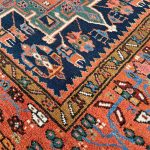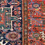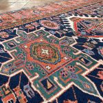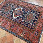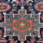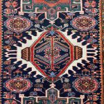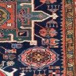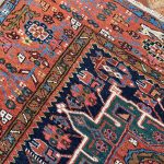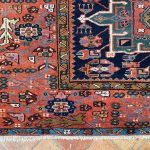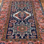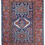 Karaja carpets and rugs were woven in a village in the northeast of the Heriz region of Persia, not far from the Azerbaijan Border. The rugs often use 8 pointed star motifs and sometimes they weave in animals and people which adds great interest. They are easily recognisable with three repeating medallions similar to those in caucasian rugs. The central motif has the latch-hooked design and the other two are eight-pointed stars. This large carpet has more of a Heriz design and early Serapi colours mixing all three designs in many ways.