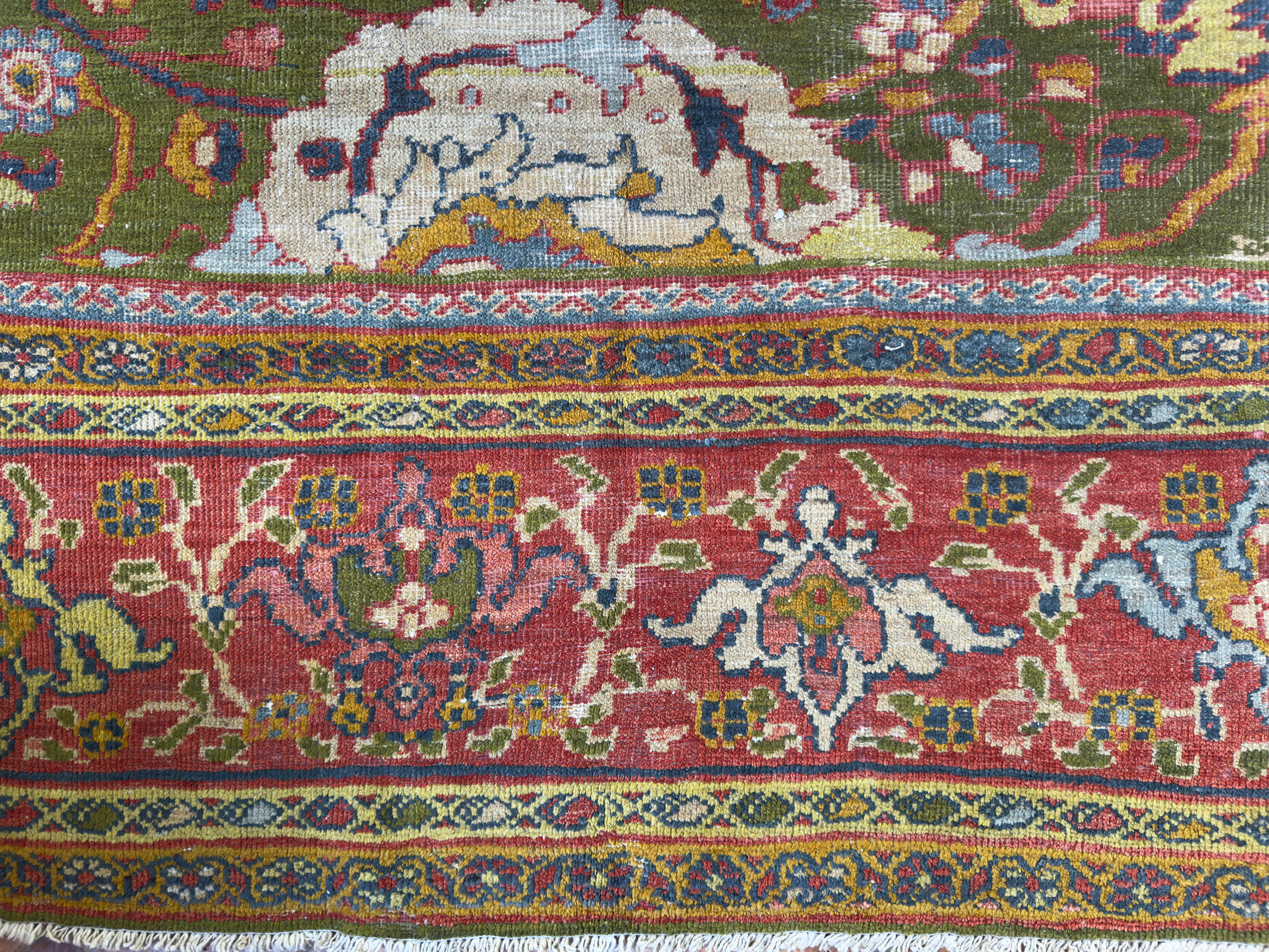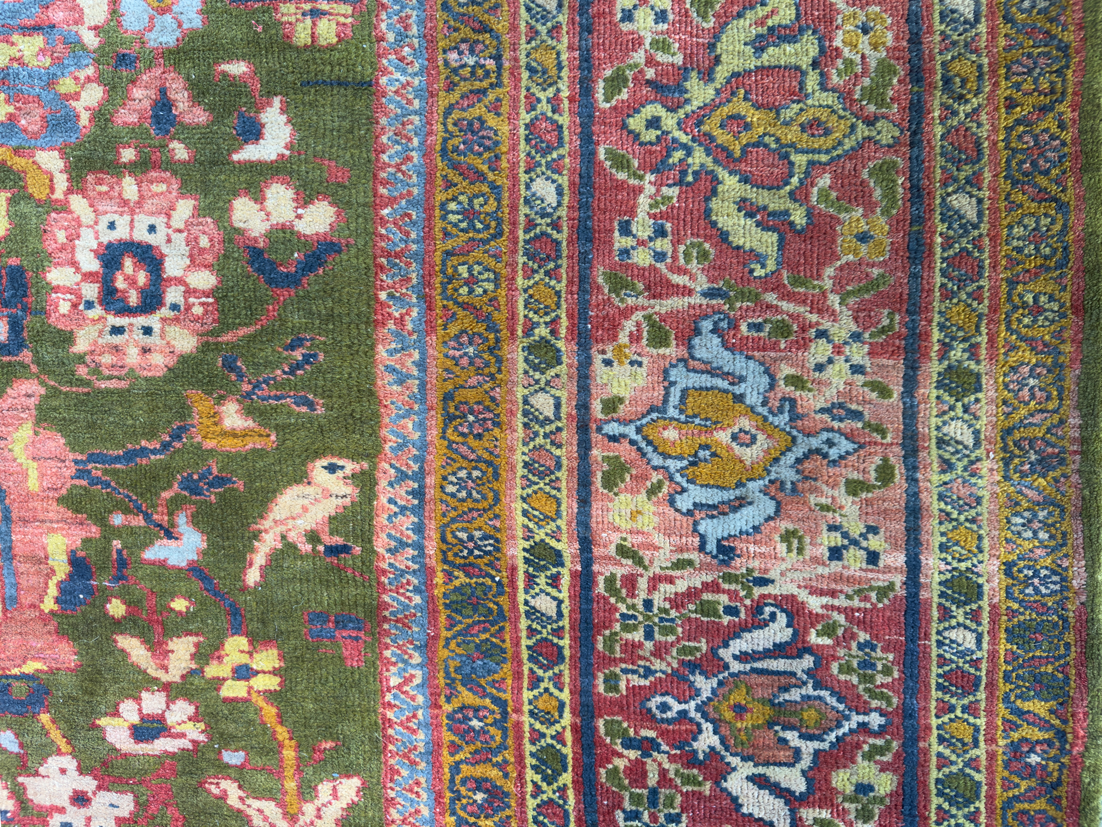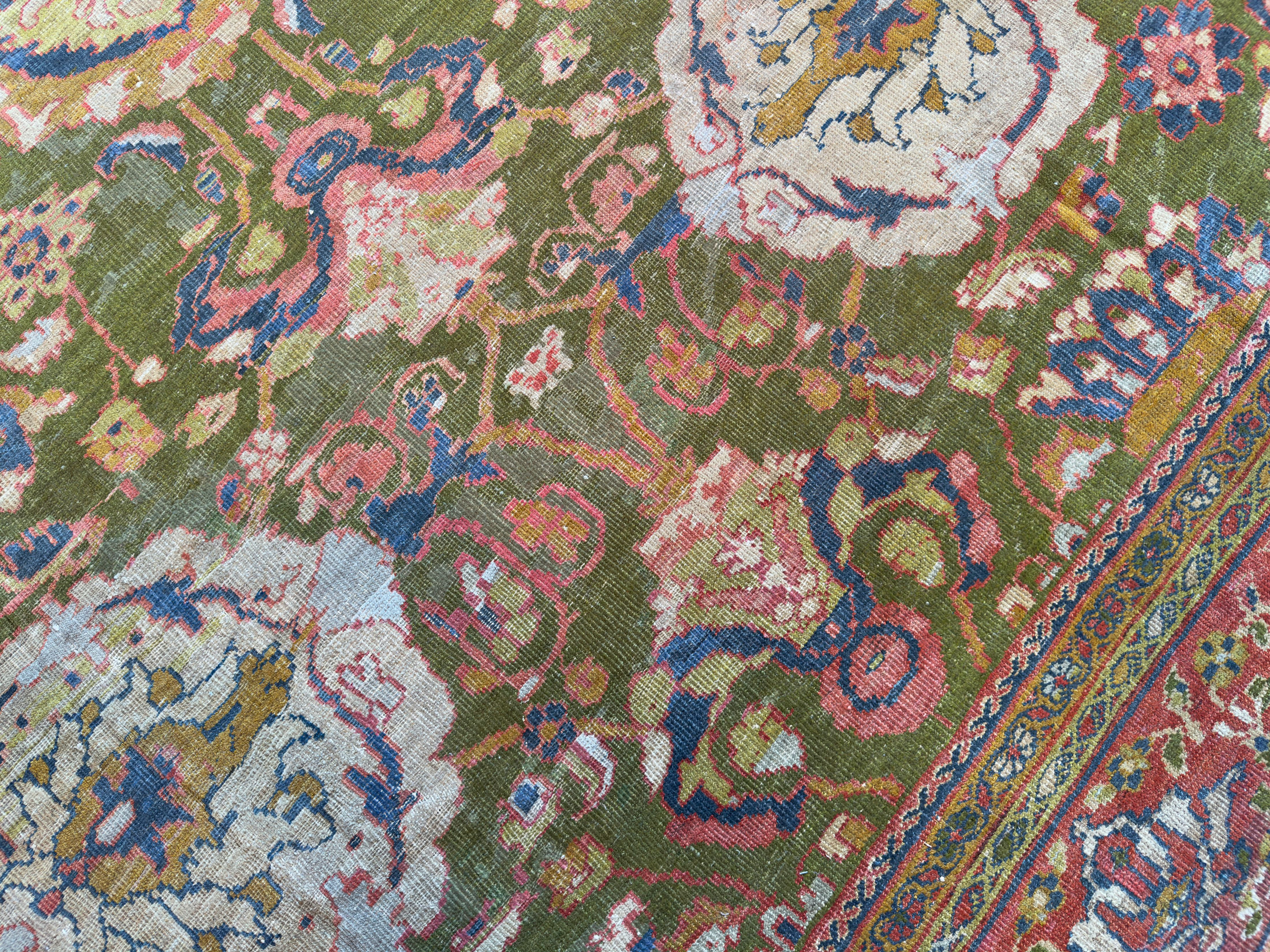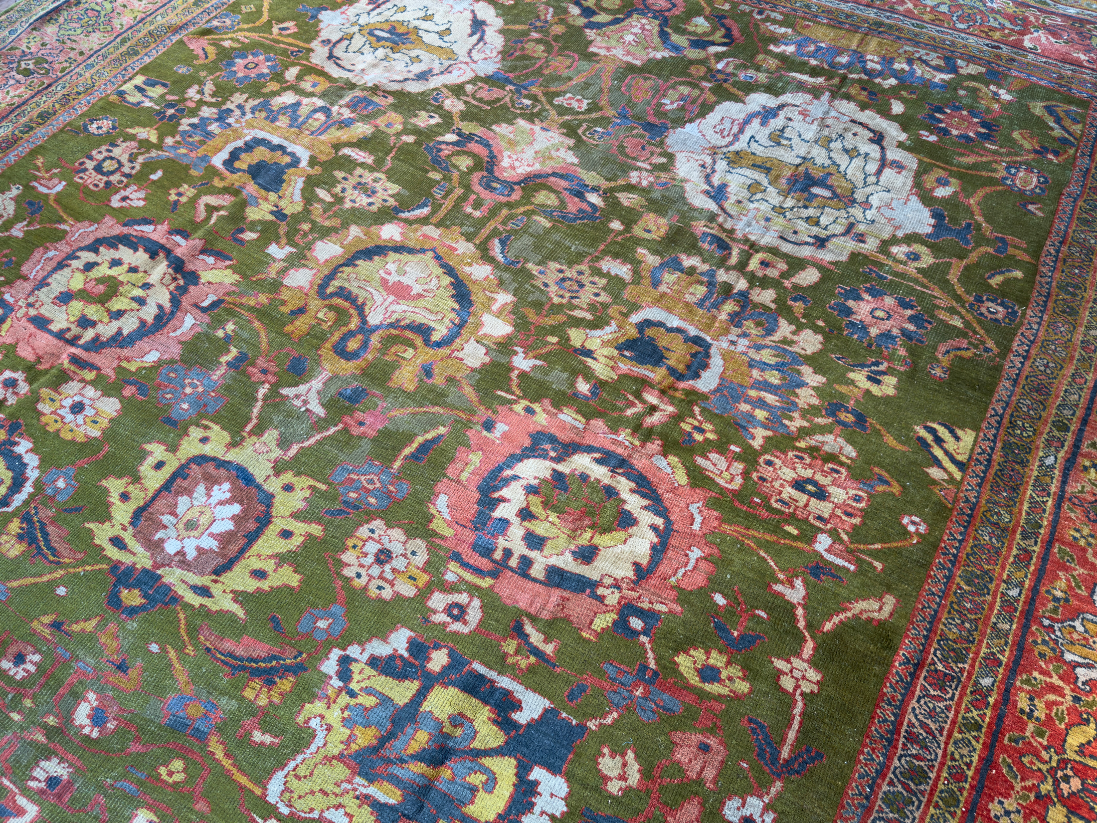 A rare green back ground antique Ziegler carpet, woven around 1880-1890, the large scale design is exquisite with amazing yellow, pale blues and pink natural dyes.  A warmer red border colour with a flowing border design is wonderful compliment to the overall look of this large carpet.