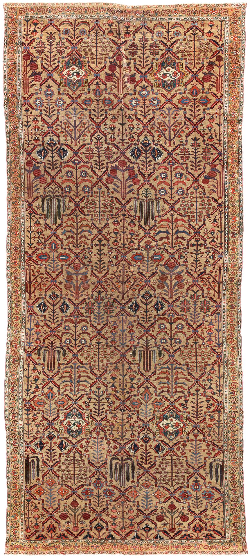This is an incredibly rare antique North-West Persian kelleh carpet from the early 19th Century. Lattice design Kelleh carpets such as this are attributed to the north-west of Persia, woven in different areas – from Karadja to Kurdistan and the more tribal patterns are from Shashavan villages. Within the beautiful lattice design are varying shrubs and trees, with willow trees, fruit trees depicting pomegranates and beautiful colourful medallion patterns too. The border is often seen on Shashavan weavings, and Kurdish pieces too, the S motif in the border is known as a protective sign, warding off evil and used as the Sun in Caucasian rugs from Azerbaijan, often scattered throughout the main field of a rug.