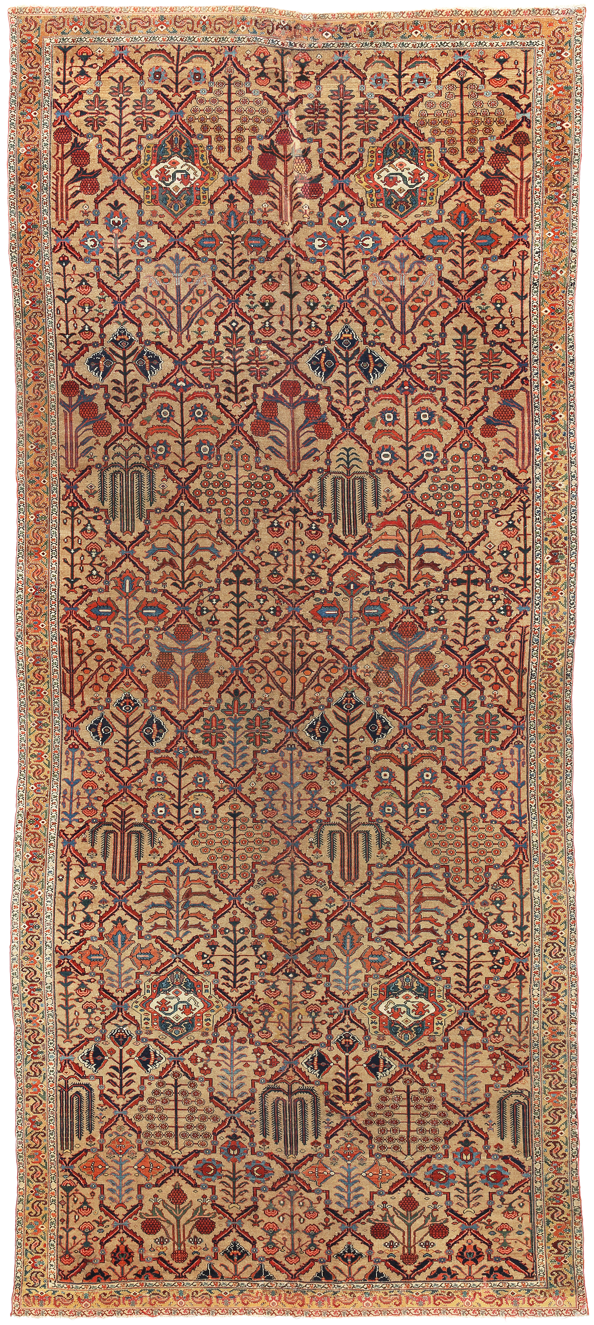 So many fascinating elements to this early weaving, the yellow to camel toned border and background are also a rare colour combination. More often colours would be contrasting blues and reds used for the main field and border. A truly exceptional, collectable and rare Kelleh carpet dating around 1820-1830. Due to the carpets age, restoration has taken place in some areas, which can be seen on the high resolution image, it does not detract from the beauty of this carpet in anyway in our opinion. For its 200 year age restoration is fairly minimal and been done well a long time ago. The dyes have faded differently due to their age.