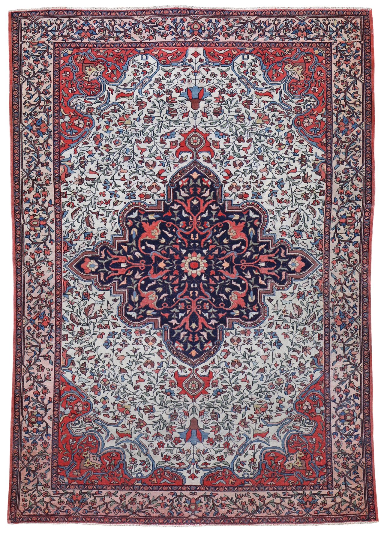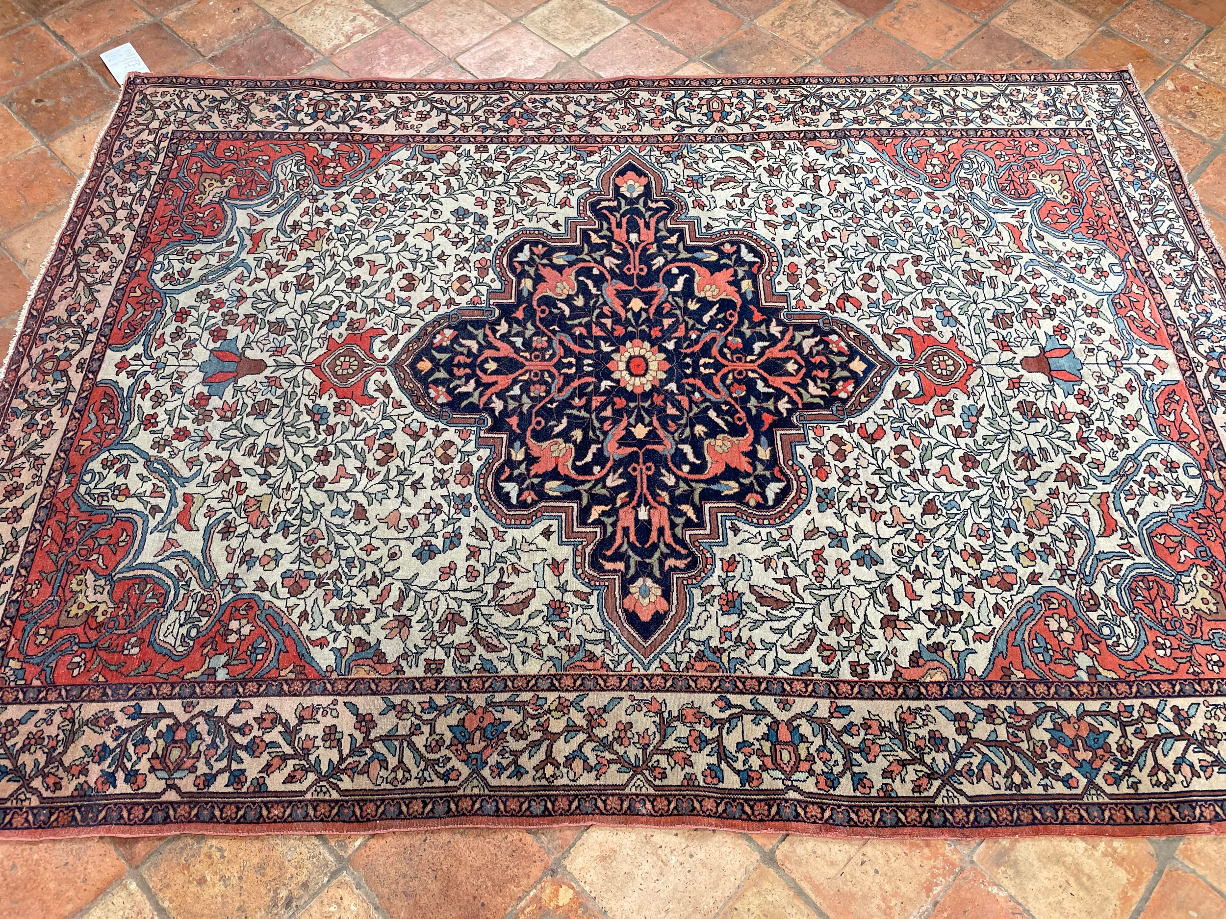 A very handsome and fine antique Malayer rug.  The condition of this piece is very good indeed, with a finely cut wool pile, this type of finer town rug often had a lower pile as the wool has been cut very flat. The deep blue medallion is very beautiful in execution, with a wonderful pale ground surrounding it.  The red corner spandrel design is extremely elegant, please do look at the additional images to see all the intricate floral detail and faded ancient colours.