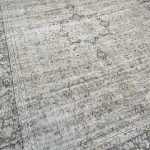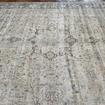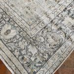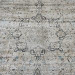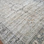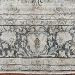 A vintage distressed Kerman carpet all hand-woven using natural dyes and wool. These beautiful contemporary carpets are expertly distressed, giving it great character allowing it to work in both a traditional and contemporary settings. The design is a classical design and using a beautiful gentle floral design from Kerman. Woven with muted grey/blue colours, and faded peach tones with hints of lovely pale blue and yellows on the flowers, giving this lovely piece an antique look.